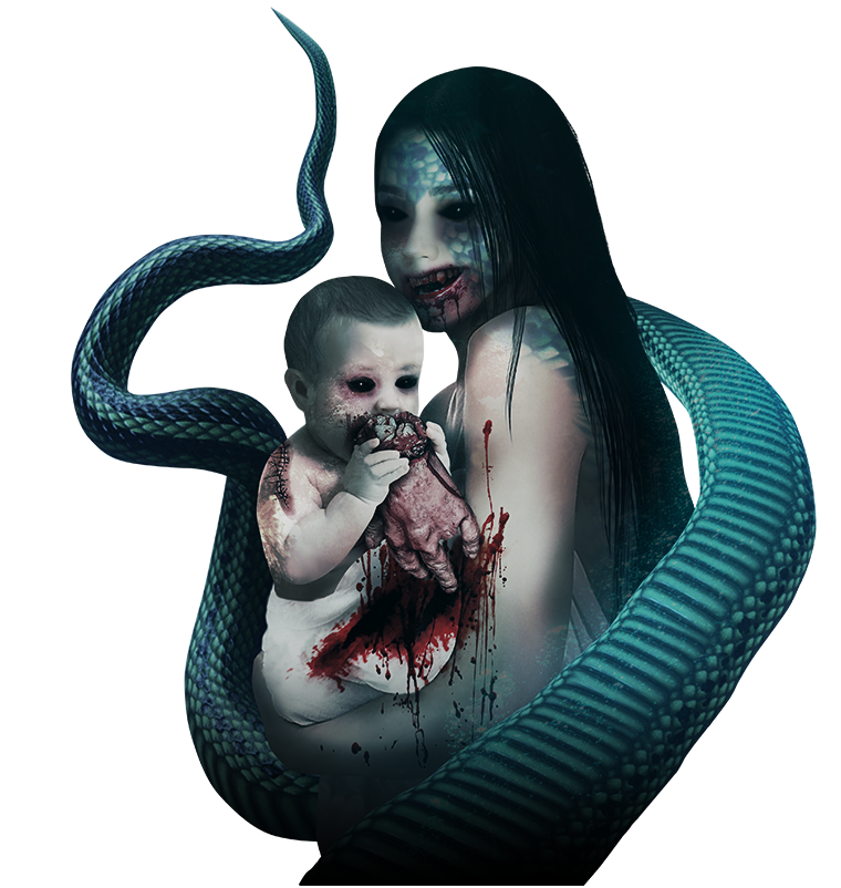 赤ん坊を抱いている、胴体は蛇のよう、